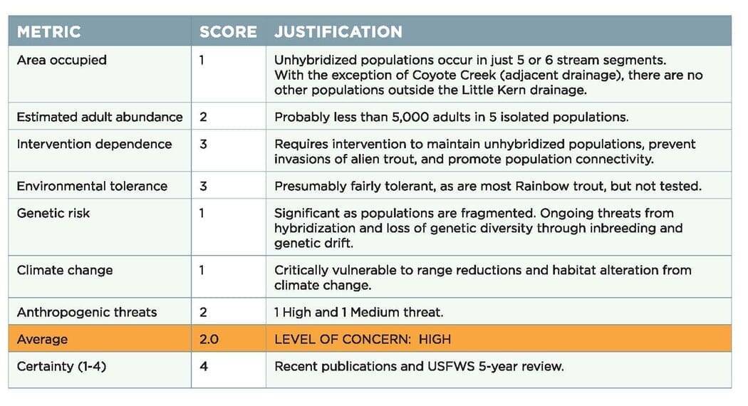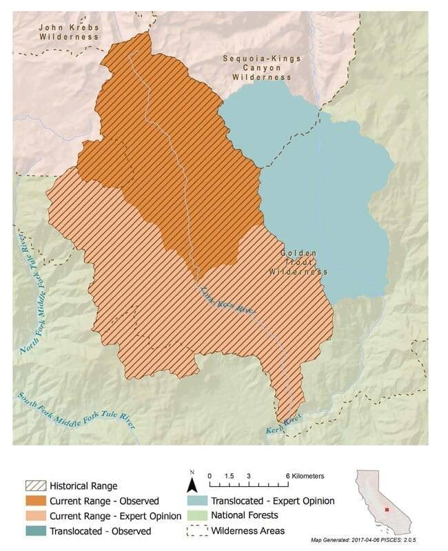 Little Kern Golden trout were historically isolated to roughly 160 km (about 100 mi.) of streams in the Little Kern River and its tributaries by natural barriers such as waterfalls and cascades. Hybridization with non-native trout reduced their habitat range to less than 16 km (10 mi.) of streams in the 1970s. By the year 2000, after decades of restoration, barrier management, and reintroduction through stocking, their habitat was restored to over 51 km (32 mi.) of streams and three lakes. Relatively “pure” Little Kern Golden trout can be found today in upper North Fork Clicks Creek, Upper Clicks Creek, Trout Meadow Creek, Little Kern River above Broder’s Cabin, and the Little Kern River above Wet Meadows Creek in Sequoia National Forest (Tulare County).