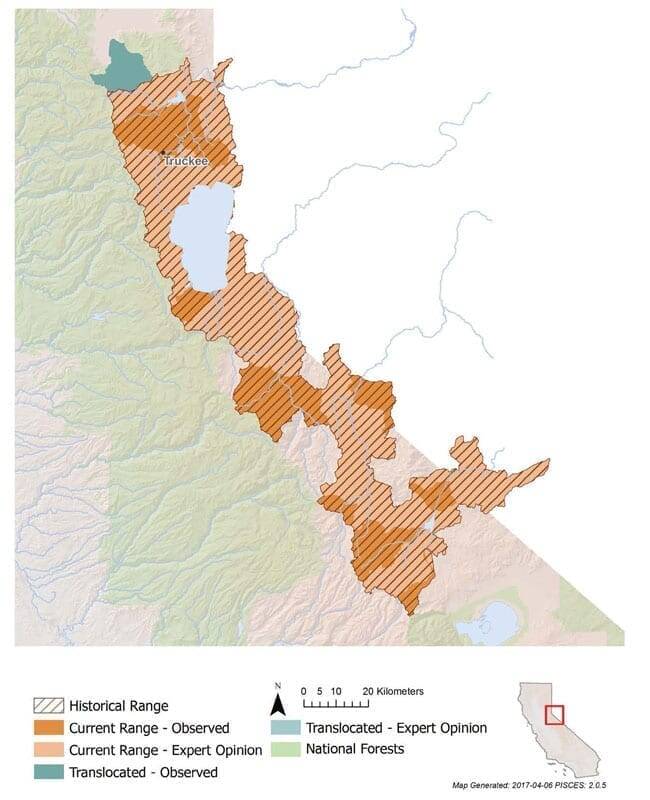 Mountain whitefish historically occupied similar habitats to Lahontan Cutthroat trout on both the California and Nevada sides of the Sierra Nevada. Their current range in California includes the Lower, Little, and Upper Truckee, East Fork Carson, and East and West Walker river drainages on the east side of the Sierra Nevada, and perhaps the West Fork Carson River as well. They can also be found in natural lakes, including Tahoe, Independence, Cascade, and Fallen Leaf lakes.