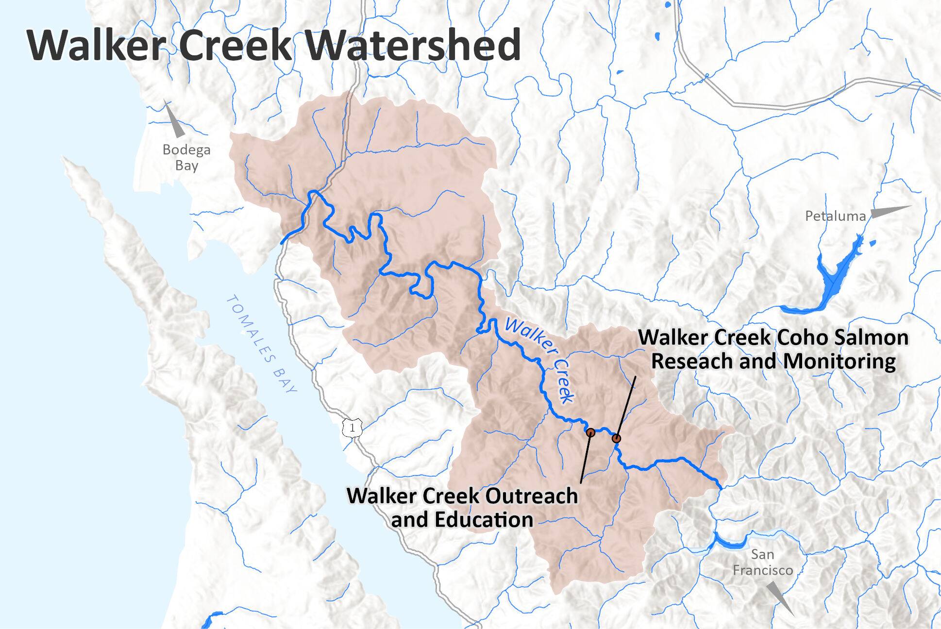 Walker Creek, located in Marin County, flows year-round from the Soulajule Reservoir to Tomales Bay and the Pacific Ocean, draining approximately 76 square miles. Walker Creek is primarily a rural watershed with over 90% of its land privately owned for ranching and agricultural uses. Riparian woodland along the mainstem provides protected habitat for fish such as federally endangered coho salmon and threatened steelhead.